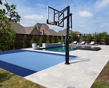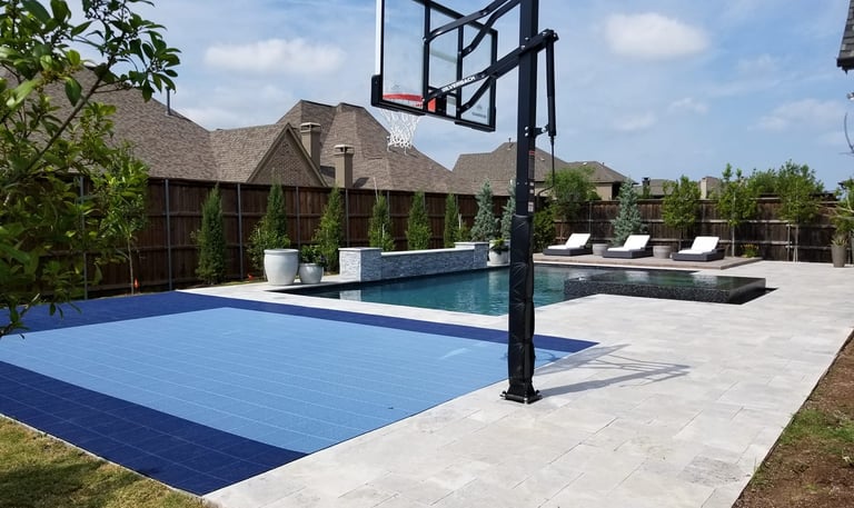 A contemporary backyard layout that blends recreation and relaxation, pairing a modern pool with integrated sport elements to create a dynamic outdoor space designed for both everyday living and weekend entertaining.