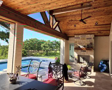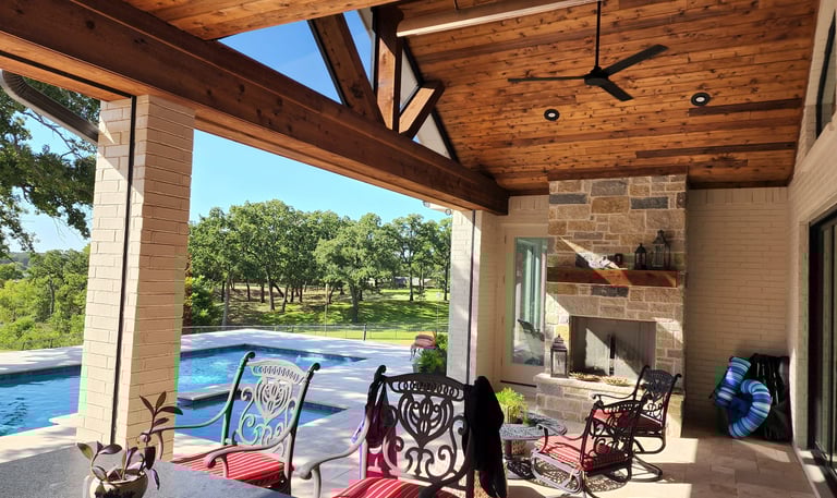 A vaulted wood-beam patio with built-in fireplace, crafted to extend comfort and style beyond the walls of the home while providing a shaded, inviting setting for year-round outdoor enjoyment.