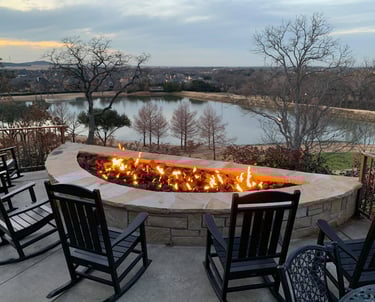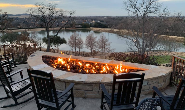 A custom stone fire feature positioned to frame the view, transforming cool evenings into warm, intimate outdoor gatherings with a natural focal point that enhances both ambiance and scenery.