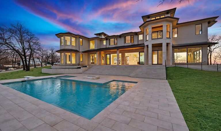 A sleek geometric pool designed to mirror the home’s architecture, creating a seamless transition from indoor luxury to outdoor living while elevating the entire backyard into a cohesive, resort-inspired environment.